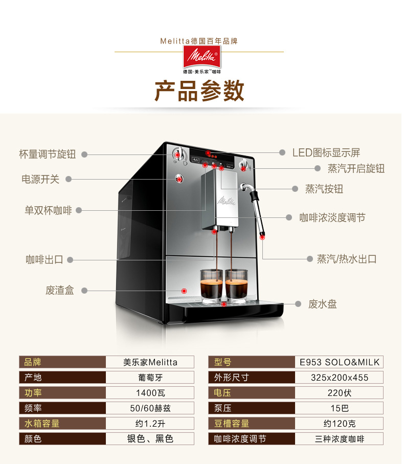 Melitta/美乐家 E953全自动咖啡机 家用现磨意式 整机欧洲进口